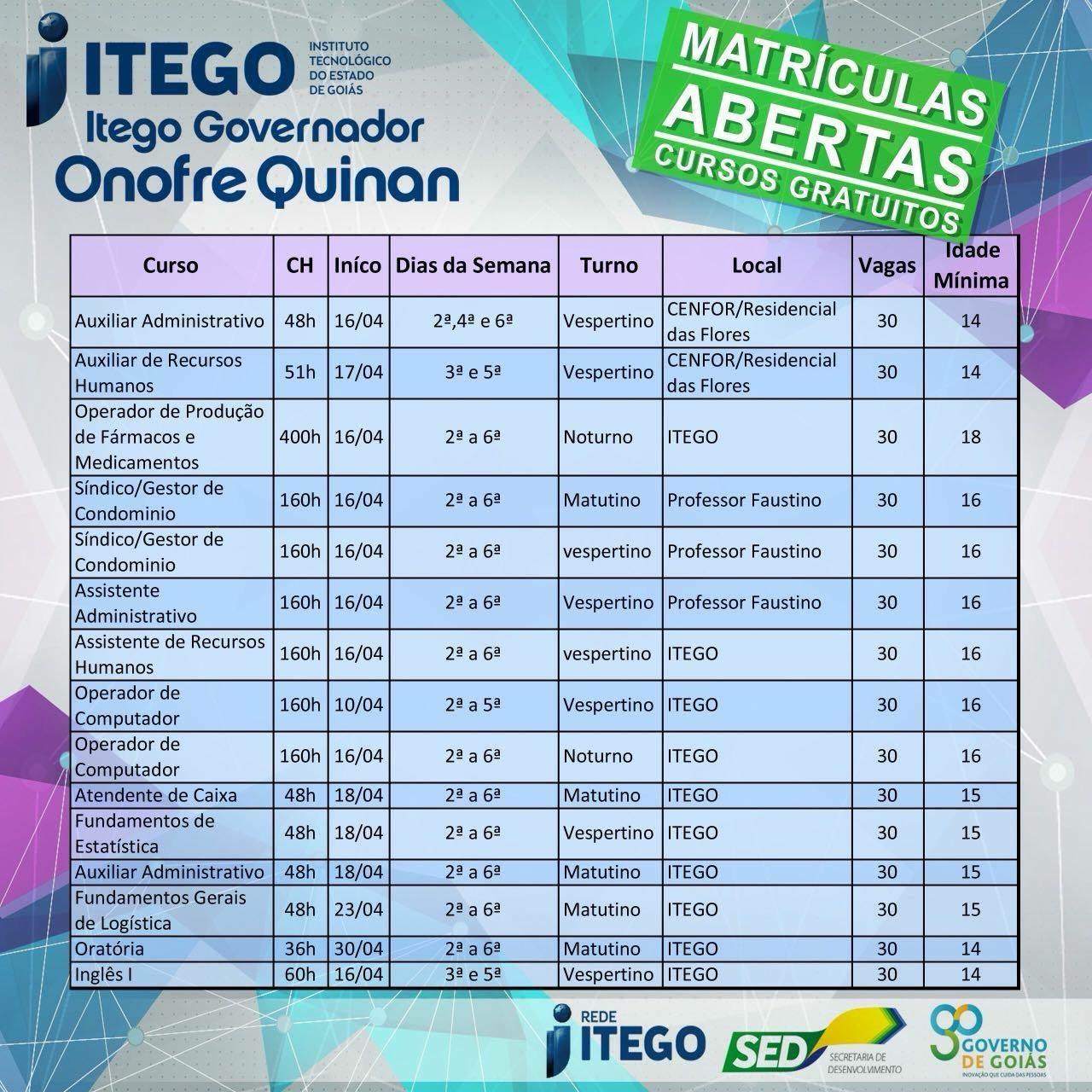 O Instituto Tecnológico do Estado de Goiás (Itego) - Governador Onofre Quinan em Anápolis está com as matrículas abertas para diversos cursos gratuitos com início das turmas agora em abril.Serão mais de 400 vagas para cursos de auxiliar administrativo, auxiliar de recursos humanos, síndico, operador de produção de fármacos e medicamentos, operador de computador, atendente de caixa, estatística, logística, oratória e inglês. Será oferecido pela primeira vez, o curso de síndico/gestor de condomínio. Serão 60 vagas com uma grade multidisciplinar e carga horária de 160 horas. Serão disponibilizadas turmas nos turnos matutino e vespertino, com possibilidade de se abrir uma terceira turma noturna. Para realizar a matrícula o interessado deve levar cópia do RG, CPF, comprovante de escolaridade e de endereço, título de eleitor (para maiores de 18 anos) e uma foto 3x4 ao Itego.ServiçoITEGOEndereço: Rua VP-4D – Módulos 3 a 6 Qd. 8A – DAIA - CEP: 75132-105 – Anápolis – GoiásFones: (62) 3328-2476 / 3328-2477 / 3328-2478#mc_embed_signup{background:#fff; clear:left; font:14px Helvetica,Arial,sans-serif; } /* Add your own MailChimp form style overrides in your site stylesheet or in this style block. We recommend moving this block and the preceding CSS link to the HEAD of your HTML file. */-Imagem (1.1508646)
