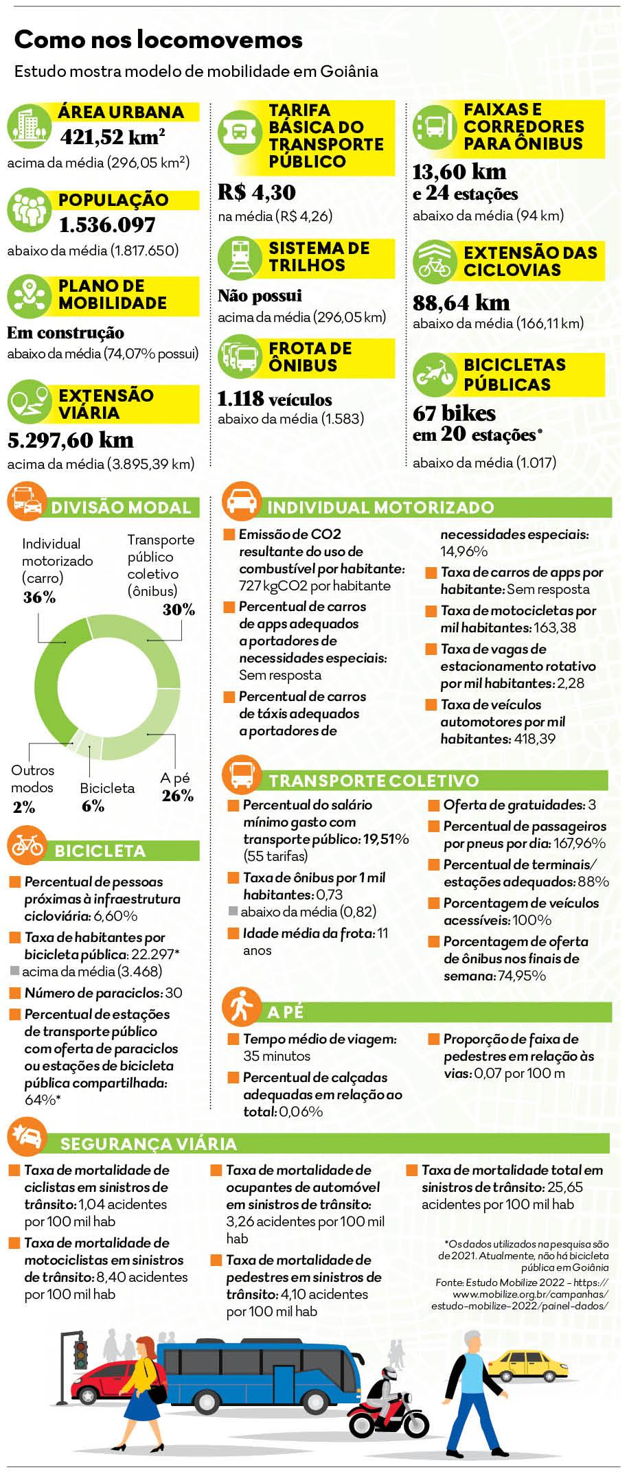 Em Goiânia, há apenas 0,7 faixa de pedestres a cada quilômetro de ruas e ainda somente 0,06% das calçadas são consideradas ideais, de acordo com o Relatório Final do Estudo Mobilize 2022 - Mobilidade Urbana em dados e nas ruas do Brasil. A situação identifica a dificuldade para 26% da população que se locomove caminhando pela cidade, também de acordo com a pesquisa. Por outro lado, os carros e as motocicletas possuem toda uma estrutura de 5,2 mi quilômetros (km) espalhados pelos 421,5 km² de área urbana, ambos números acima da média das capitais do Brasil, mesmo para uma população abaixo da média.O levantamento mostra uma cidade espraiada e com vias destinadas à locomoção por veículos motorizados, como as pontes e viadutos, que dificultam a mobilidade dos pedestres. Coordenadora da pesquisa em Goiânia, a arquiteta e urbanista Flávia Cirqueira lembra que todos são pedestres em algum momento. “Essa reflexão é importante para que possamos compreender que todos precisamos nos atentar para a qualidade do espaço urbano destinado ao pedestre, ou seja, a todos nós.”A arquiteta e urbanista explica que a “qualidade das calçadas é imprescindível para que o deslocamento do pedestre ocorra, não existe outra opção que favoreça o pedestre a não ser qualificar o seu espaço na via”. Além disso, ela explica que a ausência de faixas de pedestres na cidade indica um problema grave de continuidade. Segundo Flávia, nesse caso, “o fluxo é interrompido por não ser possível atravessar a via do automóvel de forma segura e o percurso torna-se maior, o que demonstra que o modo a pé não é priorizado em relação ao automóvel”.Os dados da pesquisa apontam que os veículos individuais motorizados são os modos priorizados no sistema de mobilidade urbana goianiense, “sendo ainda necessária uma mudança de postura da gestão pública e da comunidade como um todo”, de acordo com Flávia. O estudo informa que 36% das pessoas utilizam o veículo individual. Geógrafo e perito criminal especializado em eventos de trânsito, Antenor Pinheiro avalia que a pesquisa confirma que os investimentos para a infraestrutura viária da cidade “destinam-se à minoria da população que faz os seus deslocamentos diários por meio de carros e motocicletas”.Na prática, a priorização dos meios de transporte individuais motorizados tem resultado na redução dos espaços mais calmos para os pedestres, que possibilitaria caminhadas e travessias seguras pela cidade. Há casos como as construções dos complexos viários, como da Avenida Jamel Cecílio, o que dificultou a travessia dos pedestres na via, e na Avenida 85 com a T-63. Outro exemplo é a construção, ainda em andamento, do corredor do BRT Norte-Sul, que provocou a redução das calçadas ao longo da Rua 90 para que fossem mantidas duas faixas para carros e motos. Há ainda problemas com a ocupação indevida de calçadas, com obstáculos, materiais e até mesmo com mesas e cadeiras.“A maioria das pessoas (64%) que utilizam ônibus, bicicletas ou se deslocam a pé não conta com a mesma atenção. Ou seja, os que se utilizam de transportes ativos e coletivos continuam a não merecer a atenção do poder público, contrariando assim a Lei Federal da Mobilidade Urbana”, diz Pinheiro, que é membro da Associação Nacional de Transportes Públicos (ANTP). Ele considera ainda que os dados apontam que as calçadas da cidade não são consideradas espaços de mobilidade públicos. “Isso corrobora para uma cidade cada vez mais brutalizada. A legislação prevê que as calçadas são vias públicas, mas não são assim consideradas.”O engenheiro de Trânsito e professor do Instituto Federal de Goiás (IFG) Marcos Rothen ressalta ainda que a inadequação das calçadas gera muitos acidentes. “A existência de uma calçada adequada é também um fator importante para a saúde das pessoas. Em Goiânia é visível que as condições para se andar a pé são inadequadas e inseguras”, diz. Ele afirma ainda que em suas aulas conversa com os alunos sobre as condições das vias para pedestres e os relatos apontam problemas até mesmo nas áreas mais urbanizadas, inclusive no Parque Vaca Brava, do Setor Bueno. “A falta de condições para caminhar leva as pessoas a utilizarem os veículos motores, e como há deficiência do transporte coletivo, acabam usando carros e motos”, explica o especialista.Viagem a pé dura 35 minutosO Estudo Mobilize 2022 indica que o tempo médio de viagem a pé em Goiânia é de 35 minutos. Levando em consideração a velocidade média de uma pessoa adulta, em torno de 5 quilômetros por hora, é possível estimar que o pedestre, na capital, se locomove entre 2,5 e 3 quilômetros. “Em relação ao modo ativo, a oferta de infraestrutura é relevante, mas não exclusiva, pois os destinos devem ser próximos, alinhando-se à outras políticas setoriais e de desenvolvimento urbano, entrando na questão macro do planejamento urbano e da gestão integrada”, afirma a urbanista Flávia Cirqueira, sobre a necessidade de organização da cidade para que os pedestres tenham para onde ir nas proximidades.O professor do Instituto Federal de Goiás (IFG) Marcos Rothen ressalta que Goiânia tem longas distâncias para quem anda a pé. “Mesmo nas áreas mais centrais existem grandes espaços vazios, o que aumenta as distâncias.”Infraestrutura determina escolha final do usuárioDe acordo com o Relatório Final do Estudo Mobilize 2022 - Mobilidade Urbana em dados e nas ruas do Brasil, em Goiânia, 36% dos deslocamentos são feitos por transporte individual motorizado (carro e moto), sendo o modo mais utilizado. Em seguida está o transporte público coletivo, com 30% e o transporte a pé (26%), enquanto que a bicicleta é utilizada em 6% das viagens e os demais 2% se referem a outros modos. A coordenadora da pesquisa em Goiânia, Flávia Cirqueira, explica que a oferta de infraestrutura para 