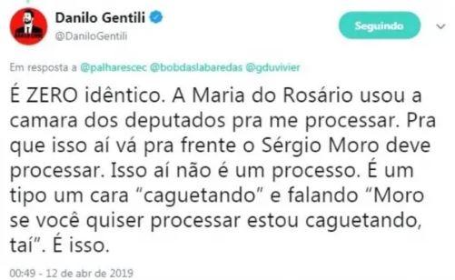 O ator Gregório Duvivier usou as redes sociais nesta quinta-feira, 11, para pedir ‘solidariedade’ ao presidente Jair Bolsonaro em um processo ao qual responde na justiça. “O Jair Bolsonaro é solidário com Danilo Gentili, mas o Ministério Público move processo idêntico contra mim por ofensa a ele (Bolsonaro) e Moro (ministro da Justiça). Aguardo solidariedade”, escreveu Duvivier no perfil oficial dele no Twitter.Nesta quarta-feira, 10, Danilo Gentili foi condenado a detenção por injúria contra deputada Maria do Rosário. No entanto, ele poderá recorrer em liberdade. No dia seguinte, o presidente da República, Jair Bolsonaro, publicou solidariedade ao humorista através do Twitter. "Me solidarizo com o apresentador e comediante Danilo Gentili ao exercer seu direito de livre expressão e sua profissão, da qual, por vezes, eu mesmo sou alvo, mas compreendo que são piadas e faz parte do jogo, algo que infelizmente vale para uns e não para outros", escreveu Bolsonaro.De acordo com informações do site O Antagonista, o promotor Lucilio de Held Junior, do Paraná, enviou um ofício ao ministro da Justiça, Sergio Moro, informando um suposto crime de injúria por parte de Gregório Duvivier contra Jair Bolsonaro e o próprio ex-juiz federal. O promotor diz que, em um evento que marcou um ano da prisão de Lula, em Curitiba, o humorista teria chamado Moro de “juizeco” e que “fala fino com a milícia e com os Estados Unidos”.O@jairbolsonaro é solidário com @DaniloGentili mas o MP move processo idêntico contra mim por ofensa a ele e Moro. aguardo solidariedade— Gregorio Duvivier (@gduvivier) 11 de abril de 2019Danilo Gentili respondeu a publicação do colega de profissão. “É zero idêntico. A Maria do Rosário usou a Câmara dos Deputados para me processar. Para que isso vá para frente (processo contra Duvivier), o Sérgio Moro deve processar. Isso aí não é um processo. É um cara ‘caguetando’ e falando: ‘Moro, se você quiser processar, estou caguetando, taí’. É isso”, escreveu Gentili no Twitter.-Imagem (1.1774975)